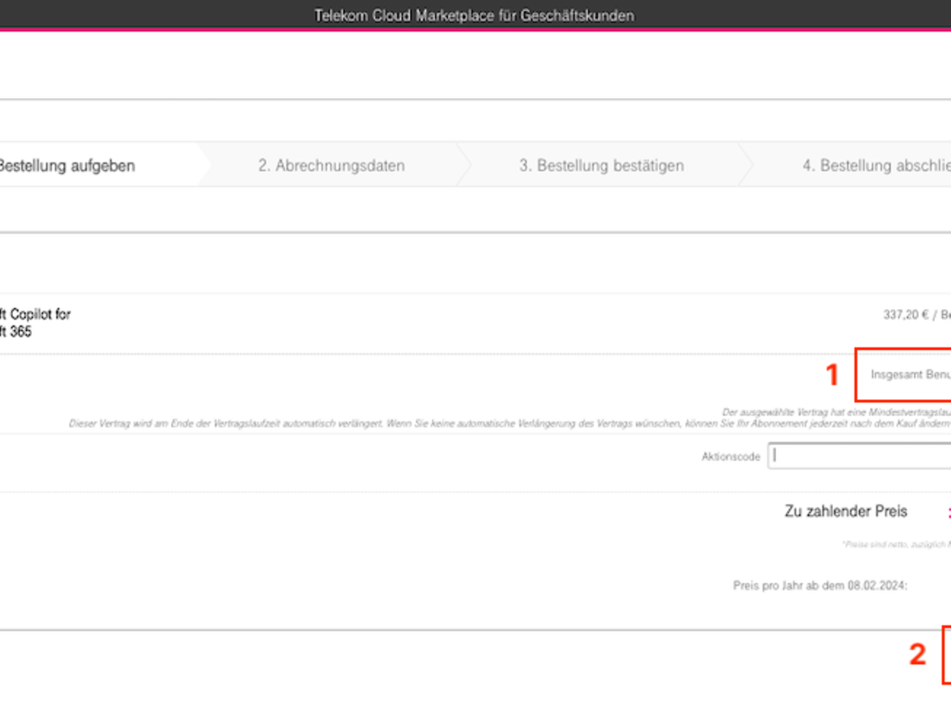 Schritt 6: Anschließend können Sie dann dem normalen Buchungsprozess des Telekom Cloud Marketplace folgen und das Upgrade abschließen.