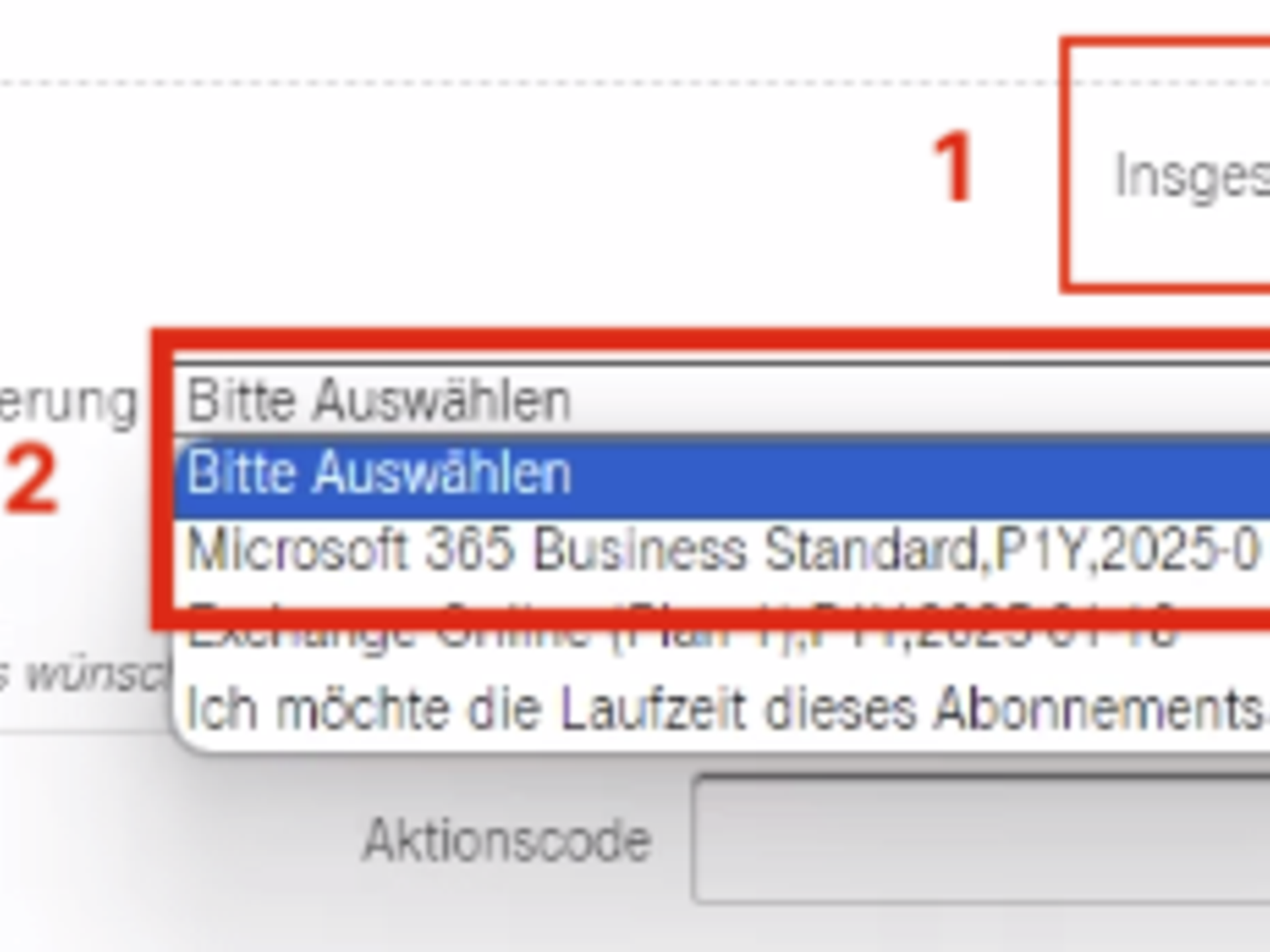 Schritt 4: Dort können Sie neben der gewünschten Anzahl von Lizenzen (1) auch das Abonnement angeben, mit dem Sie Ihre Microsoft 365 Business-Buchung synchronisieren wollen. Sollten Sie über ein berechtigtes Abonnement mit einer Laufzeit von einem Jahr (12 Monate), können Sie dieses unter „Optionen zur Laufzeitsynchronisierung“ (2) auswählen. Anschließend können Sie der Buchung wie gewohnt folgen.