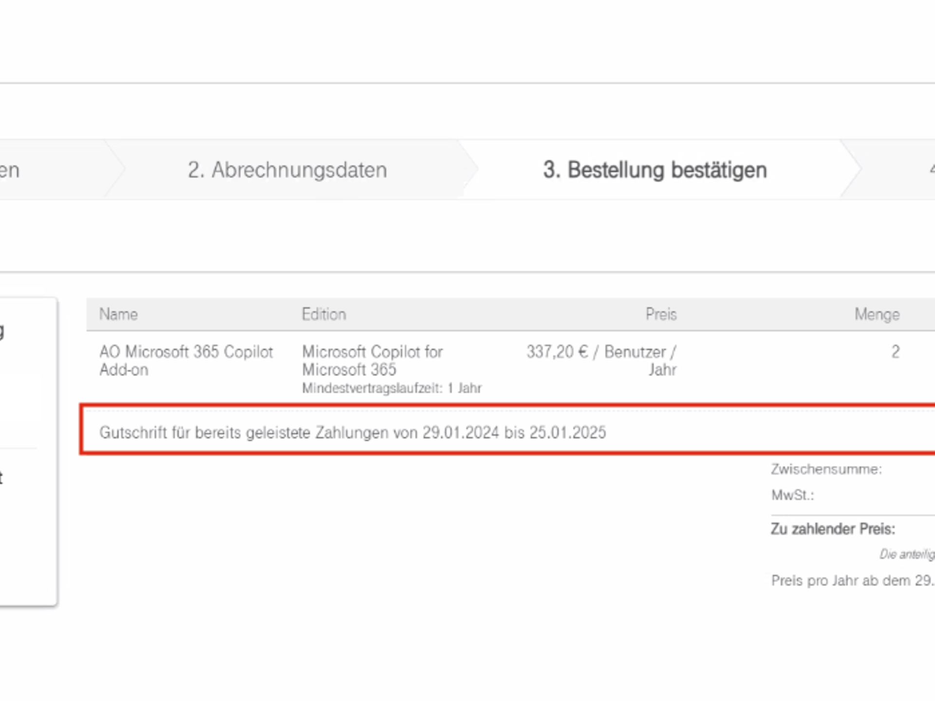 Hinweis: Die bereits bestehenden Lizenzen werden im Kaufprozess dann als „Gutschrift“ angezeigt, weil Sie bereits zuvor gebucht und abgerechnet wurden. Neu abgerechnet werden nur die neu hinzugefügten Lizenzen.