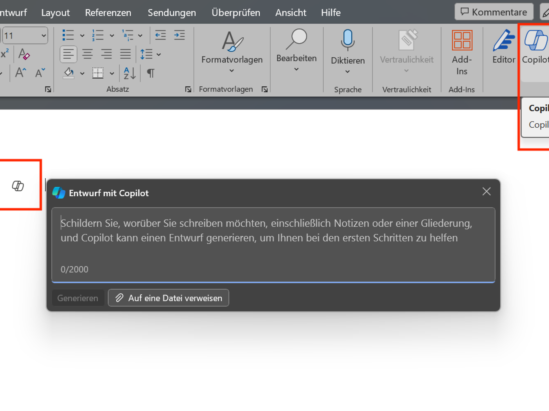 Bei Word wird Ihnen sowohl über das Menüband als auch in Ihrem Dokument die Möglichkeit geboten, auf Microsoft 365 Copilot zuzugreifen. Es öffnet sich dann ein Fenster, in dem Sie Ihren Prompt eingeben können.