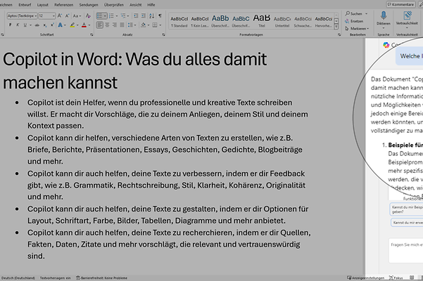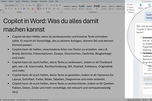 Wenn Sie wenig Zeit haben oder eine schnelle Übersicht benötigen, kann Copilot Ihr Dokument zusammenfassen. Diese Funktion ist besonders hilfreich, wenn Sie lange Berichte oder umfangreiche Dokumente auf das Wesentliche reduzieren möchten.