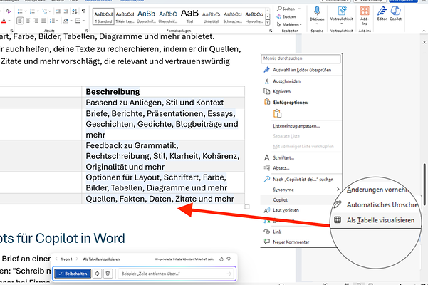 Mit Copilot können Sie lange Textblöcke schnell in strukturierte Tabellen umwandeln, was besonders nützlich ist, wenn Sie Daten oder Statistiken klarer darstellen möchten. Angenommen, Sie haben eine Liste von Verkaufszahlen, die in einem Fließtext dargestellt sind. Dies kann unübersichtlich und schwer nachvollziehbar sein. Mit Copilot können Sie diese Informationen schnell in eine Tabelle umwandeln, die klar strukturiert und leicht verständlich ist.