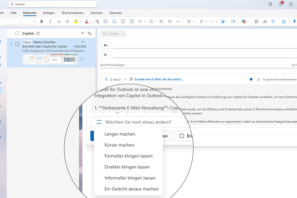 Die Bearbeitungsfunktionen von Copilot für Microsoft 365 gehen weit über einfache Korrekturen hinaus. Die KI kann Ihren Text umschreiben, Stil und Ton anpassen oder sogar bestimmte Abschnitte kürzen oder erweitern. Nehmen wir an, Sie haben einen ersten Entwurf eines Blogbeitrags erstellt, sind aber mit dem Tonfall nicht zufrieden. Copilot kann den Text auf Anfrage umformulieren und dabei sicherstellen, dass der Inhalt beibehalten wird, während der Stil verändert wird.