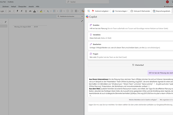 Mit Copilot in OneNote können Sie Ihre Notizen und Planungen effizienter gestalten. Stellen Sie sich vor, Sie planen eine Betriebsfeier und müssen verschiedene Elemente wie Gästelisten, Themen und Aktivitäten organisieren. Copilot hilft Ihnen nicht nur, diese Elemente zu strukturieren, sondern auch, passende Vorschläge für Dekorationen, Menüs und mehr zu erstellen.