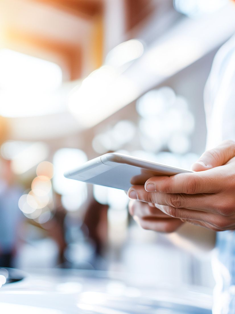 Mann ruft unterwegs seine Mails mit dem Tablet ab
