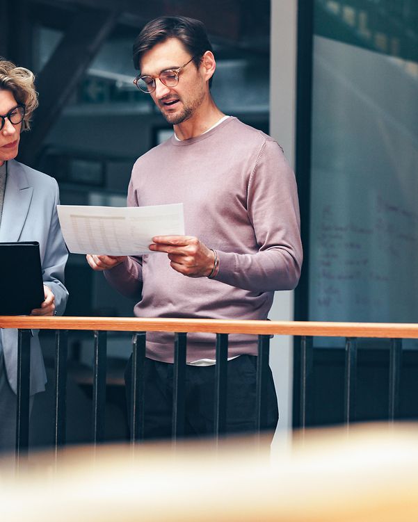 Geschäftsleute lesen gemeinsam ein Dokument. Zwei Fachleute analysieren ein Angebot zur Cloud Infrastructure in einem Büro