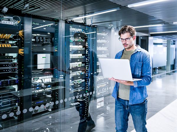 Ein Techniker steht vor einem Serverschrank der Telekom