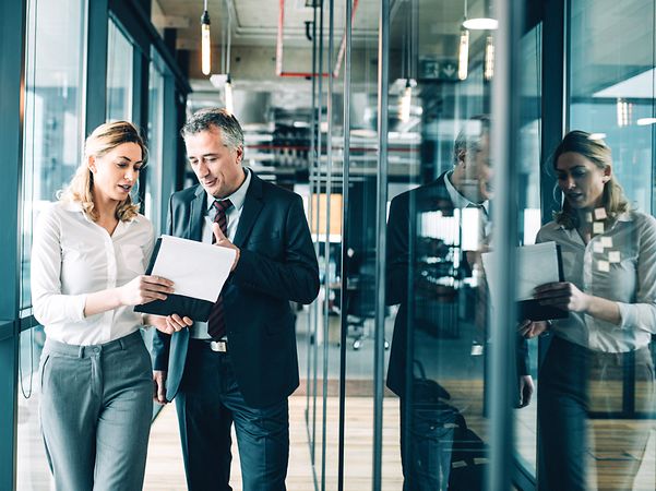 Zwei Kollegen laufen mit einem Tablet über einen Gang im Büro und diskutieren über DevOps-as-a-Service