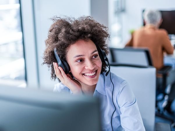 Freundliche junge Frau mit Headset im Buero der Handelsblatt Media Group