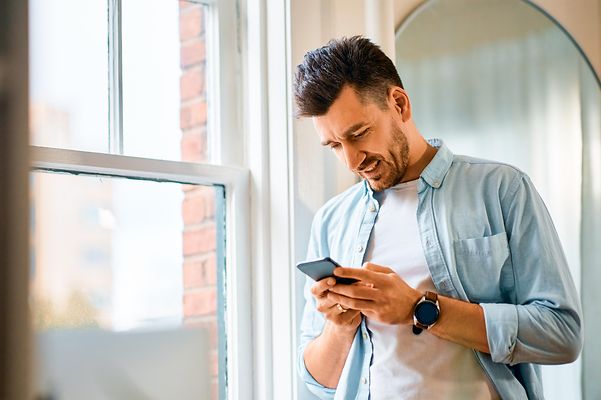 Person führt den Fördermittel-Quick-Check am Handy aus