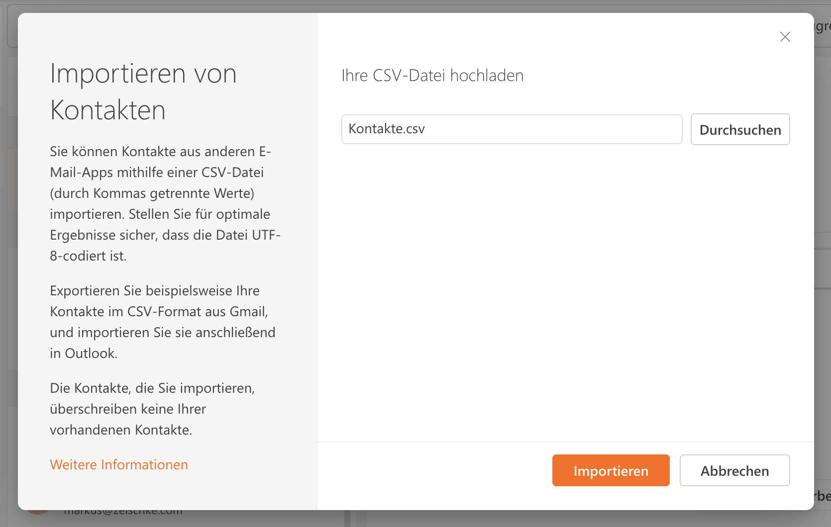 Schritt 5: Im nächsten Fenster werden Sie jetzt dazu aufgefordert eine CSV-Datei hochzuladen. Klicken Sie auf die Schaltfläche „Durchsuchen“. Wählen Sie jetzt die zuvor erstellte CSV-Datei von Ihrem Computer aus und bestätigen Sie mit einem Klick auf „Importieren“.