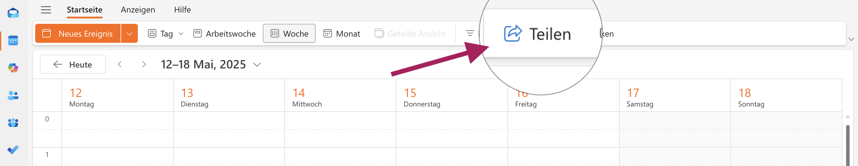 Anschließend befinden Sie sich in der Kalenderansicht von Outlook. Klicken Sie jetzt am oberen rechten Rand des Fensters auf die Schaltfläche Teilen.
