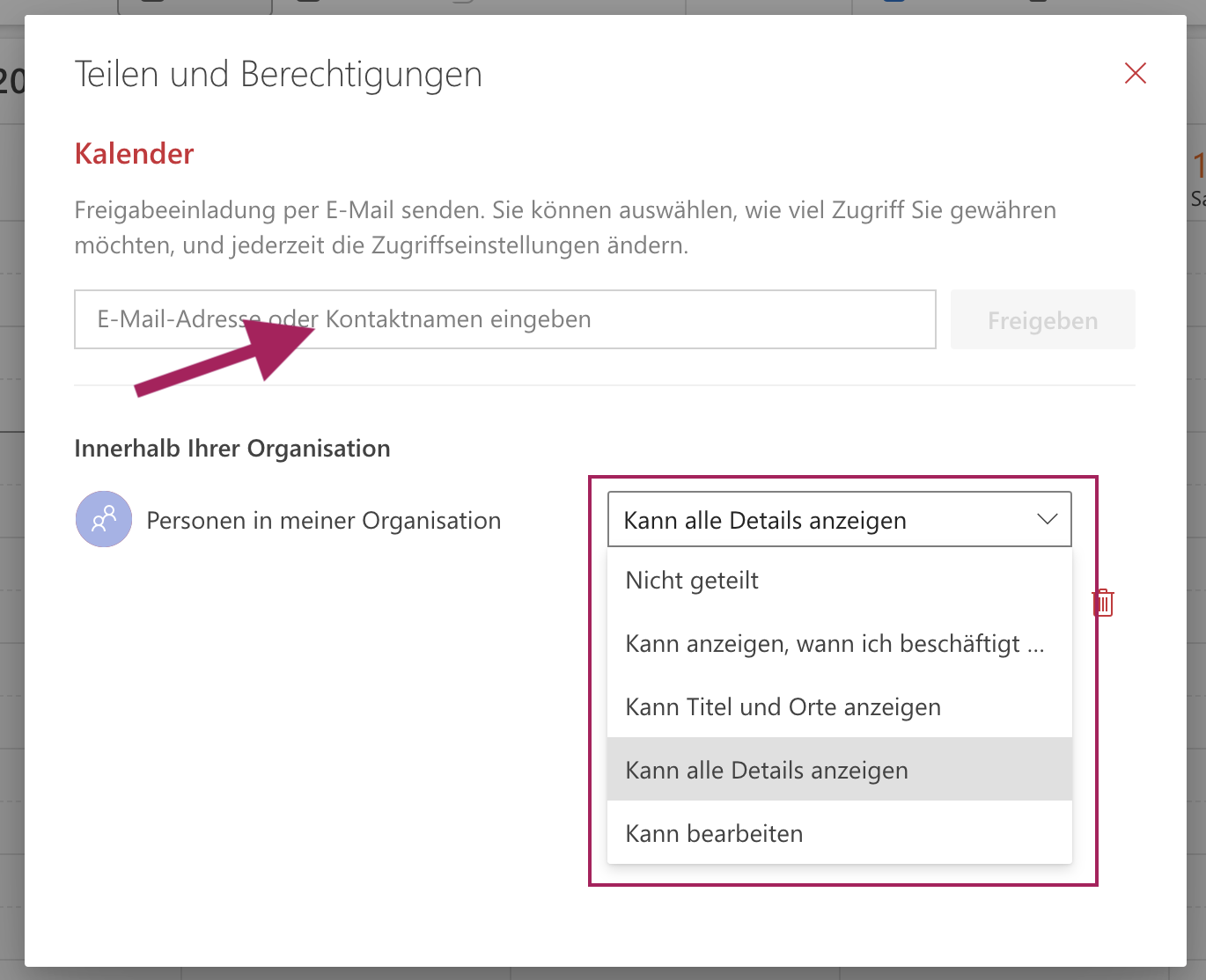 Geben Sie die E-Mail-Adresse der Person ein, mit der Sie Ihren Kalender teilen möchten und wählen Sie die Berechtigungen, die die Person auf Ihren Kalender haben soll: