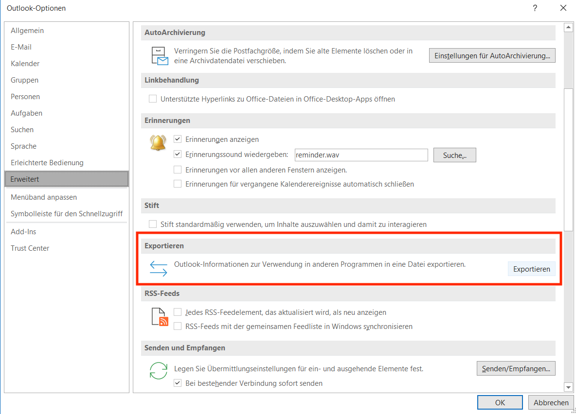 Zunächst ist ein Export der bestehenden Outlook-Struktur zu erstellen. Klicken Sie dazu auf „Datei“ am oberen linken Rand des Outlook-Fensters. Im Anschluss öffnet sich das unten zu sehende Menü. Klicken Sie hier auf „Optionen". Jetzt öffnet sich das Options-Menü. Wechseln Sie hier auf den Reiter „Erweitert“ und Suchen Sie den Abschnitt „Exportieren“.