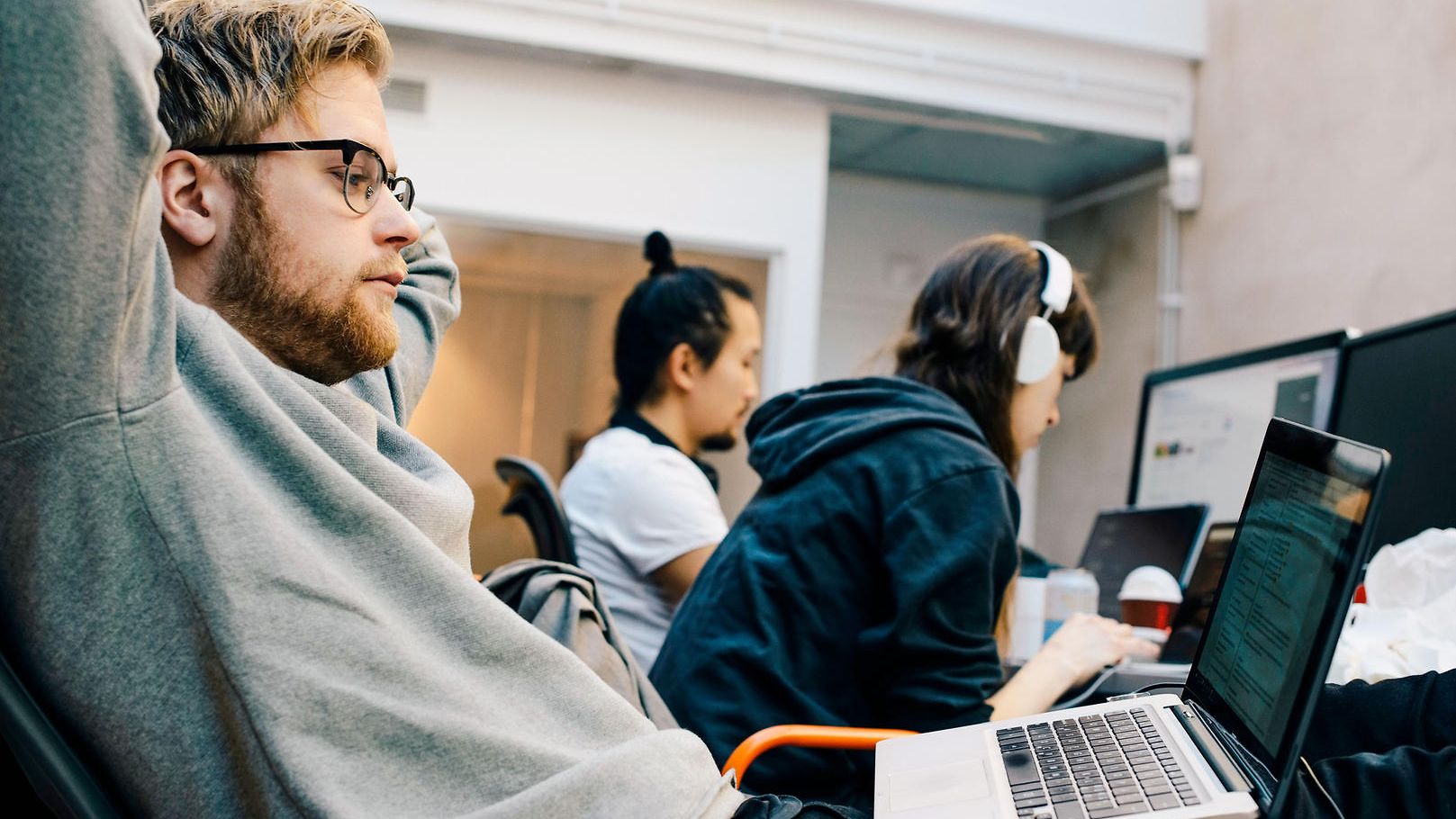 Mehrere Personen sitzen im Büro und schauen auf ihre Laptops.