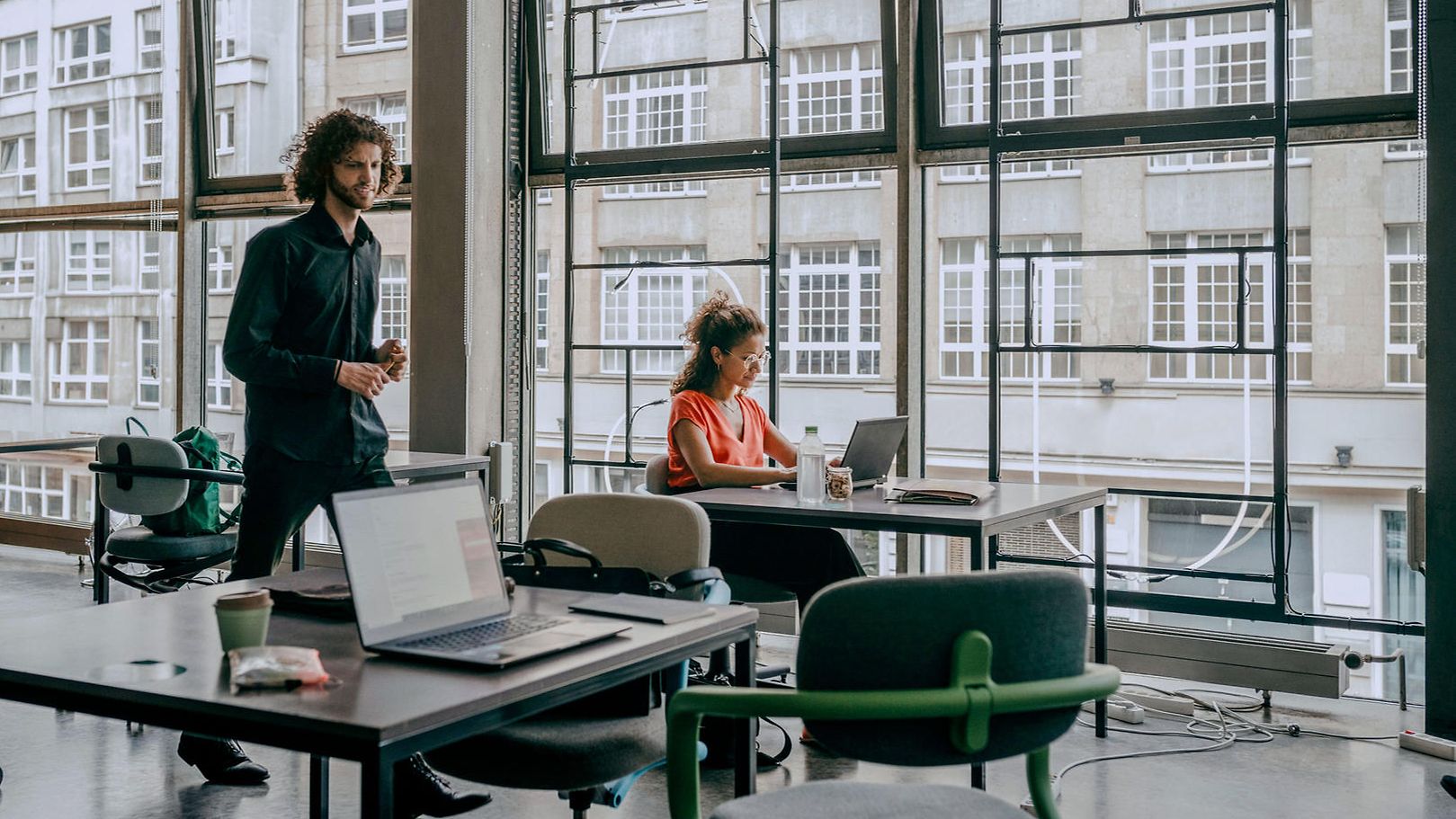 Mehrere Personen sitzen im Büro und schauen auf ihre Laptops.